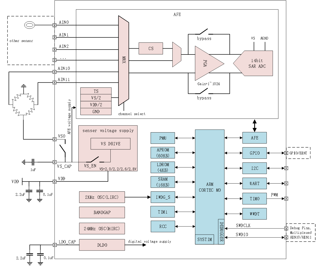 支持外部輸入引腳自(zì)由組合做爲SAR ADC差分(fēn)或單端輸入通道