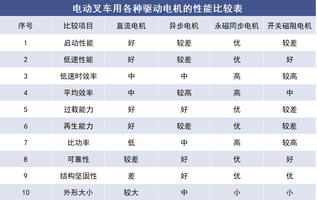 其中,永磁同步電機(jī)的綜合性能超過其它類型的電機(jī),最大(dà)優點就(jiù)是具有較高的功率密度與轉矩密度,相(xiàng)較其他(tā)種類的電機(jī),在相(xiàng)同質量與體(tǐ)積下,永磁同步電機(jī)能夠爲新能源汽車提供最大(dà)的動力輸出與加速度,是新能源叉車性能最佳的驅動電機(jī)。