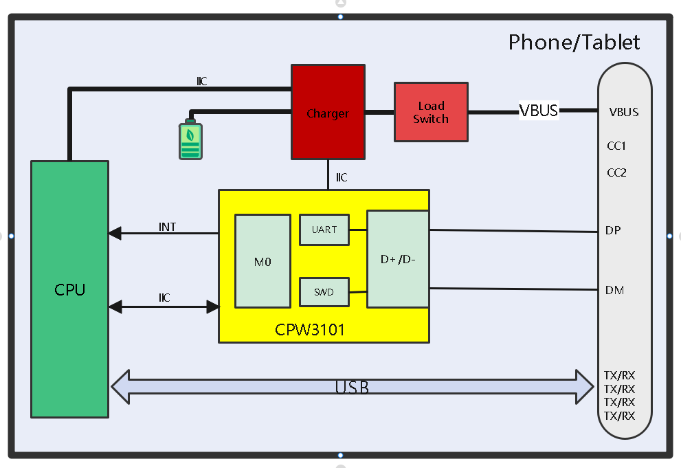 CPW3101的D+/D-分(fēn)别與USB Typec接口的DP/DM相(xiàng)連接進行UFCS協議(yì)握手、溝通,進行電源協商,在完成電源協商獲得(de)VBUS後,即可(kě)通過load switch 控制VBUS給charger供電,從(cóng)而實現智能手機(jī)、平闆及筆記本電腦等移動智能終端産品的UFCS快(kuài)速充電。