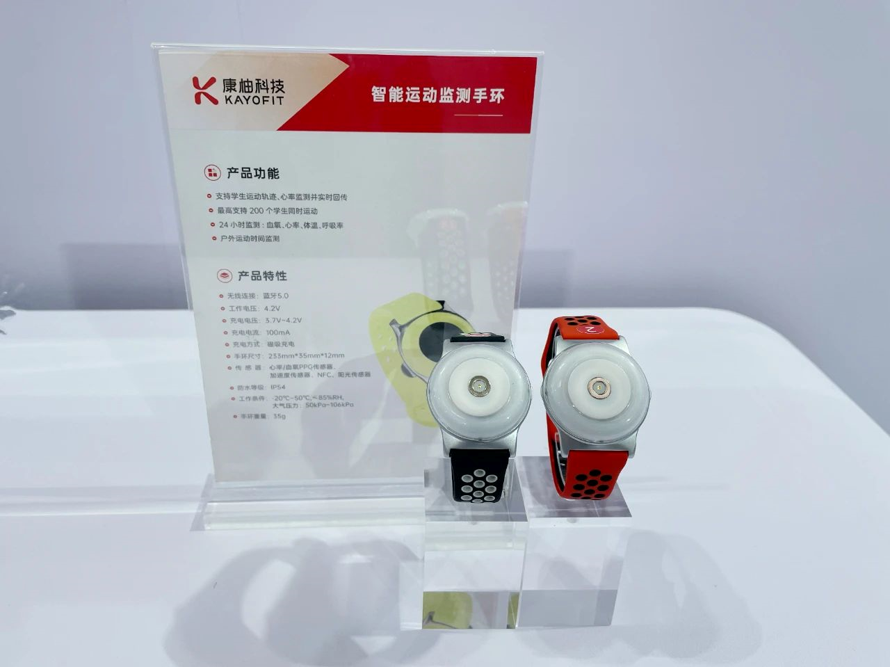 康柚科(kē)技展陳的“智能運動監測手環”産品,集成了芯海科(kē)技最新PPG芯片CS1262,支持心率、血氧等運動生(shēng)理(lǐ)參數的動态測量,測量精度業界領先。該産品能夠自(zì)動識别運動狀态、休眠狀态,支持BLE 藍牙數據傳輸,結合老師(shī)教學平闆及定位器,能夠實時查看(kàn)學生(shēng)跑步訓練情況,适用于學校(xiào)與智能場館多種場景。