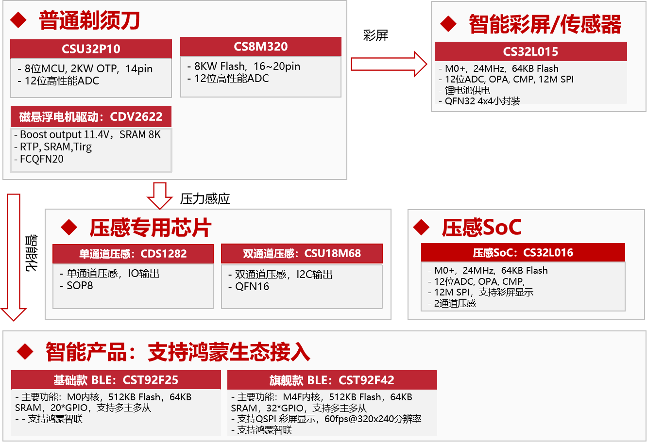 同時,芯海科(kē)技智能剃須刀創新方案具有更多産品應用優勢:√一觸即連的快(kuài)速配網,告别複雜設置,智享極簡操作(zuò)體(tǐ)驗;√即時設備查找,實現智能防丢,随時随地掌控個人(rén)物品安全;√貼心的一鍵多檔調節設計(jì),爲敏感肌膚提供細緻入微的呵護;√智能清洗提醒,定期保養,确保刀頭常用無阻且延長使用壽命;√創新的智能刀頭管理(lǐ),實時記錄刀頭狀态,保持最佳剃須體(tǐ)驗。剃須刀作(zuò)爲日(rì)常生(shēng)活的必需品,近年(nián)來(lái)在抖音等電商平台的推動下,即便在消費環境整體(tǐ)低迷的背景下,仍實現了全年(nián)零售額的穩步增長。随着高速電吹風(fēng)、便攜剃須刀等産品的不斷湧現,品類結構持續升級,将進一步推動智能個護市場的發展。芯海科(kē)技始終将客戶的商業成功作(zuò)爲公司的首要目标。結合自(zì)身(shēn)産品結構和方案優勢,爲滿足客戶的差異化需求,提供了針對個護品類的全方位解決方案,囊括從(cóng)8位到32位的主控方案,從(cóng)普通産品到智能産品的升級,從(cóng)LED數顯管到TFT屏的顯示技術(shù)等。其典型應用場景包括主控MCU、小尺寸彩屏應用、鴻蒙智聯接入及壓力觸控等。可(kě)采用鴻蒙智聯接入芯片/模組(CSM92F25、CSM92F42、CSM84F20)、8位主控MCU(CSU32P10、CS8M320)、32位主控MCU(CS32L015)、磁懸浮電機(jī)驅動(CDV2622)、壓力感應方案(壓感專用芯片CDS1282、CSU18M68;壓感SoC芯片CS32L016)等系列芯片産品,适配不同應用場景下的性能與價格需求。相(xiàng)關産品精選: