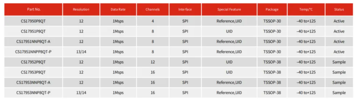 另一備受關注的産品是CS1795x系列SAR ADC,其采樣速率高達1MHz,支持16/12/8/4通道,并配備自(zì)動/手動模式切換功能。該系列産品的多通道和高集成特性,使其在BMS電池總壓和絕緣檢測、ADAS域控、電源系統監測等多路(lù)數據采集場景中有着廣泛應用,爲汽車電子系統的數據采集提供了有力支持。