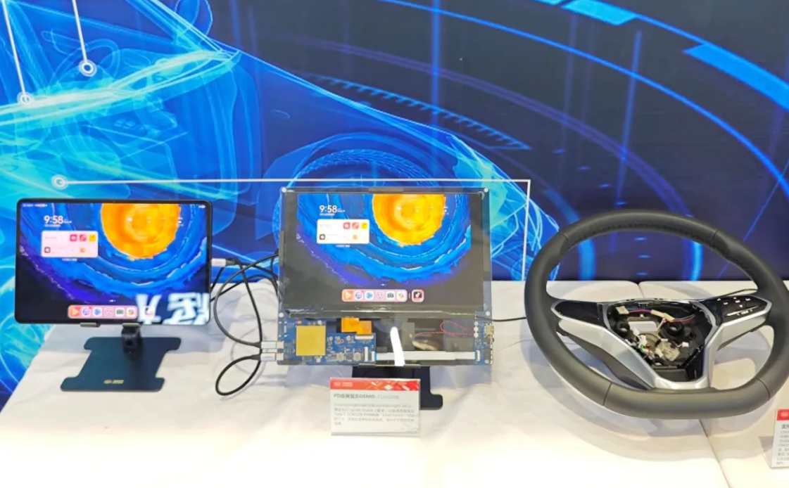 展會現場,公司展示了豐富的應用案例。包括CSA37F62芯片在汽車方向盤上的壓力觸控技術(shù)演示、CS32G020Q芯片的車載快(kuài)充與投屏功能展示,以及CS32F036Q芯片的汽車尾燈應用方案等。