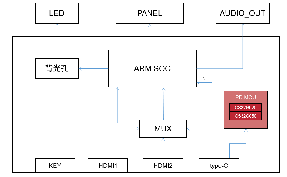 1)系統概述:PD芯片通過I2C接口與SOC連接,搭配MUX提供了顯示器電力傳輸和圖像傳輸的能力,讓顯示器可(kě)以做的更輕薄。