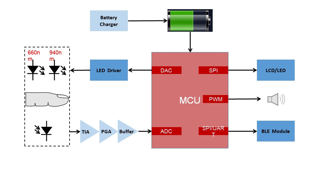LED與光(guāng)電二極管放(fàng)置在與患者指尖或耳垂接觸的小型探針中,利用手指作(zuò)爲盛裝血紅(hóng)蛋白(bái)的透明容器,使用波長660nm的紅(hóng)光(guāng)和940nm的近紅(hóng)外光(guāng)作(zuò)爲射入光(guāng)源,通過測定光(guāng)傳導強度來(lái)計(jì)算血紅(hóng)蛋白(bái)濃度及血氧飽和度。無線模塊作(zuò)爲MCU與手機(jī)之間通訊的橋梁,把MCU采集的數據傳送給手機(jī)等醫療設備,從(cóng)而記錄和分(fēn)析數據。點陣LCD主要用于實時顯示采集的數據。