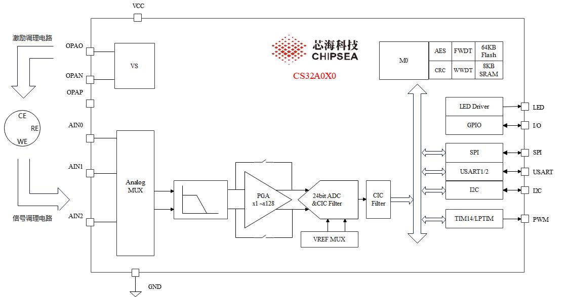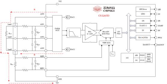 CS32A0X0内置低噪聲PGA(支持x1~x128增益),輸入阻抗可(kě)以達到G歐級别,同時内置最高22位ENOB的24位Σ-ΔADC,支持單周期穩定建立,支持50-60Hz工(gōng)頻幹擾抑制,最多支持4通道橋式差分(fēn)信号檢測,是工(gōng)業測量的最佳選擇,内置溫度傳感器加上32位MCU可(kě)以用做溫度補償,進一步提高系統精度。