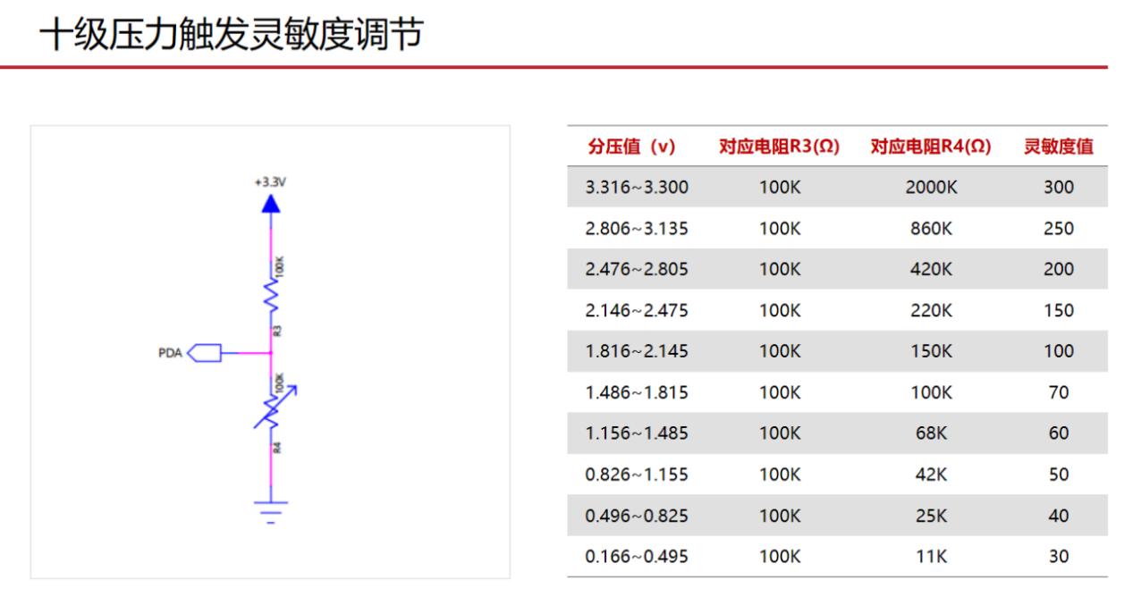 該方案通過調節PDA對地電阻值,提供“十級壓力觸發靈敏度調節”的壓力分(fēn)級,靈活适配用戶不同力度的按壓操作(zuò),從(cóng)而帶給消費用戶一緻性更強的高線性度壓力觸控體(tǐ)驗。